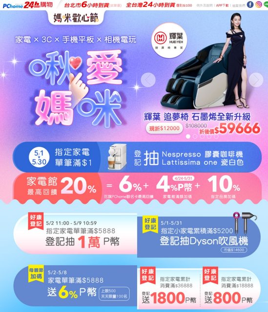 可領取P幣>>520P(指定小家電滿額登記送)+694P幣(Dyson滿萬送5%P幣)+388P幣(全盈