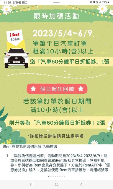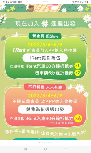 兌換方式:開啟【iRent APP】→點選左上角【≡】選單→點選【優惠管理】→【優惠券】 →【優惠券兌換】,輸入兌換碼即可兌換。 然後還有其他的活動 https://i.imgur.com/8QQHW5E.jpg