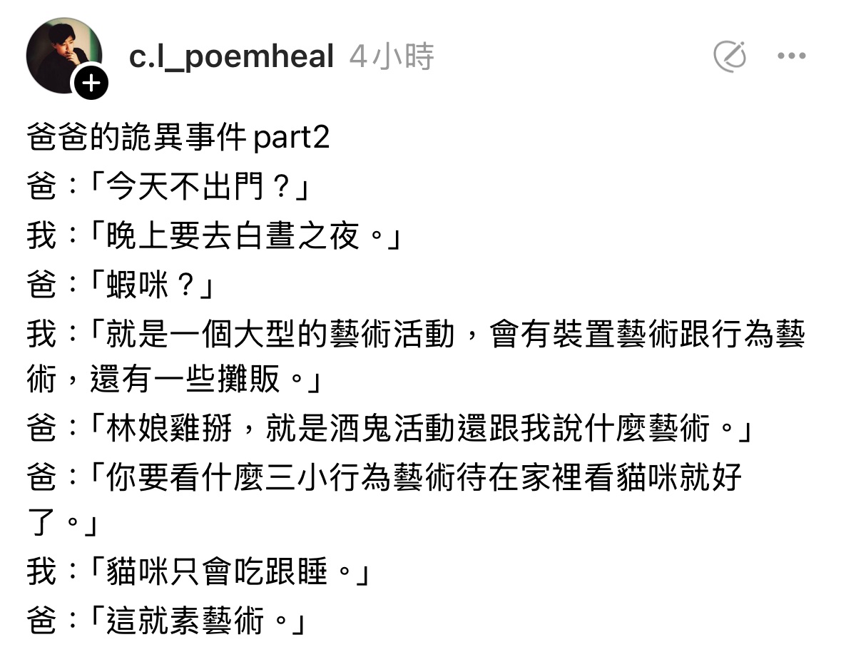 推 pda2001: 雖對這不知所云活動沒興趣 有藝術活動免 49.216.31.37 11/03 03:41