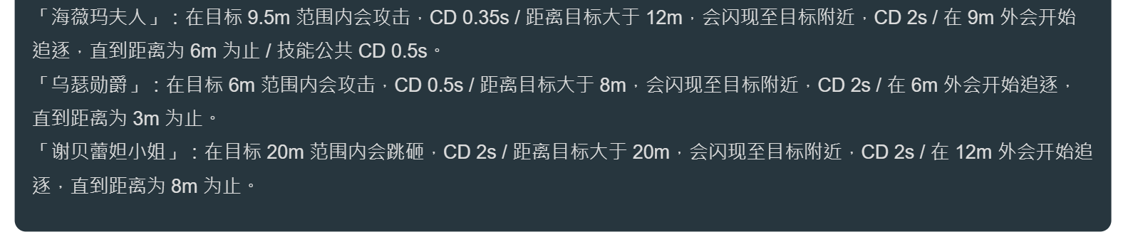 又一個勇者 https://streamable.com/vs58wa 對決 公義 目前不少說法 V1水神寄了 關於 芙寧娜 的 召喚物 來源 : 妮可少年 沙龍成員具有獨立的Al。 和以往的角色技能不同,沙龍成員不會按照固定頻率進行攻擊,而是和敵人出招一樣具有 一定隨機性和浮動。 沙龍成員的防守範圍是32米,會優先追逐敵方目標,其次是自己的主人。 1.「海薇瑪夫人」:在目標9.5m範圍內會攻擊,CD 0.35s /距離目標大於12m,會閃現至目 標附近,CD 2s /在9m外會開始追逐,直到距離為6m為止/技能公共CD 0.5s。 2.「烏瑟勳爵」:在目標6m範圍內會攻擊,CD 0.5s/距離目標大於8m,會閃現至目標附近, CD 2s /在6m外會開始追逐,直到距離為3m為止。 3.「謝貝蕾妲小姐」:在目標20m範圍內會跳砸,CD 2s /距離目標大於20m,會閃現至目標 附近,CD 2s /在12m外會開始追逐,直到距離為8m為止。 -- ※ 發信站: 批踢踢實業坊(ptt-web.org.tw), 來自: 116.241.253.82 (臺灣) ※ 文章網址: https://ptt-web.org.tw/miHoYo/M.1695905359.A.B6B