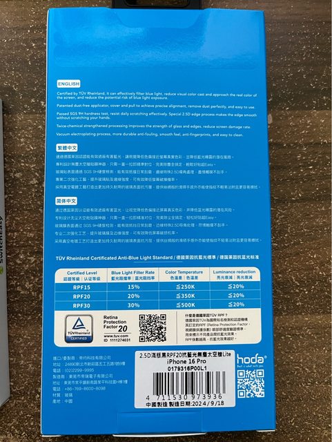 hoda iPhone 16 系列 抗藍光玻璃保護貼(德國萊因TUV RPF20認證) 附無塵太空艙