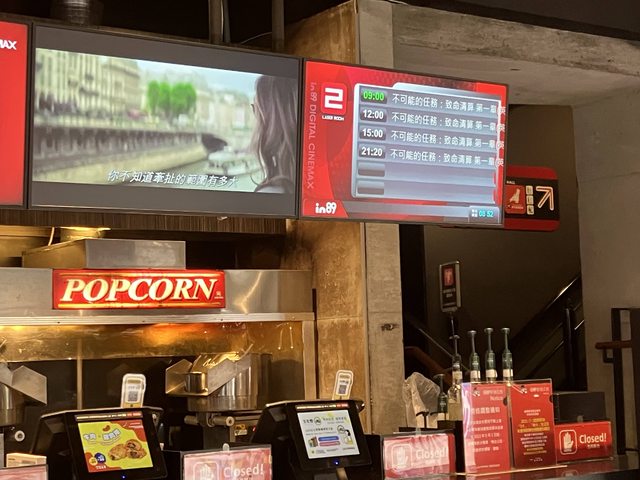後來是去看早場芭比,等取票聽到MI6預告片裡主題旋律,突然整個很像被電到,轉頭一看還真的在播MI6的預告….有圖為證: