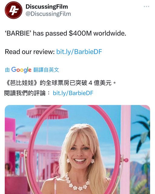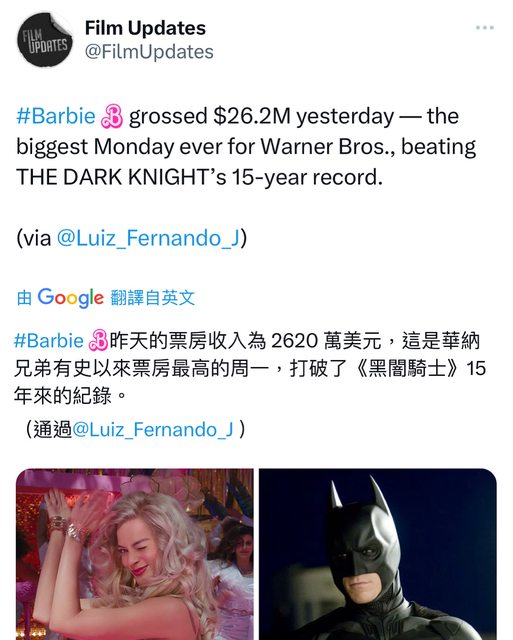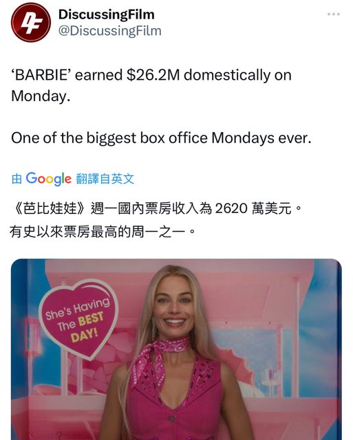 推 speed2 : 芭比全台票房一直漲 真的有機會逆襲奪冠 07/26 17:58