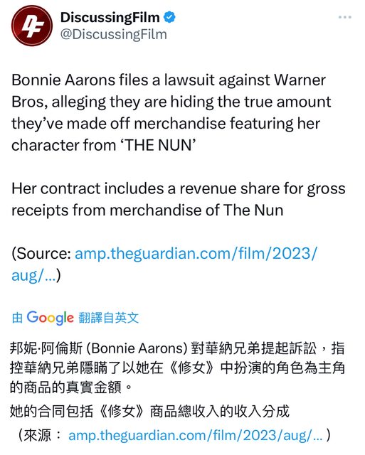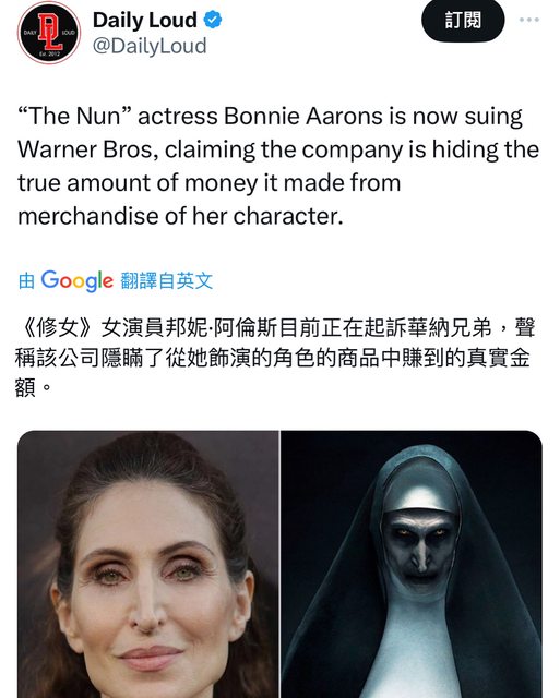標題[新聞] 分潤不如預期 《鬼修女》演員控告華納
