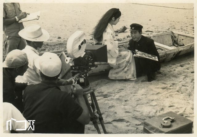 電影「夕陽西下」於日本沖繩當地外景工作照,由當年2大台語片紅星陽明(蔡揚名)(
