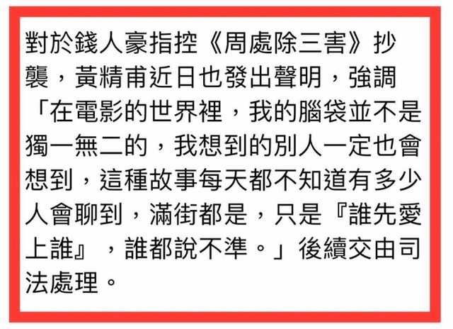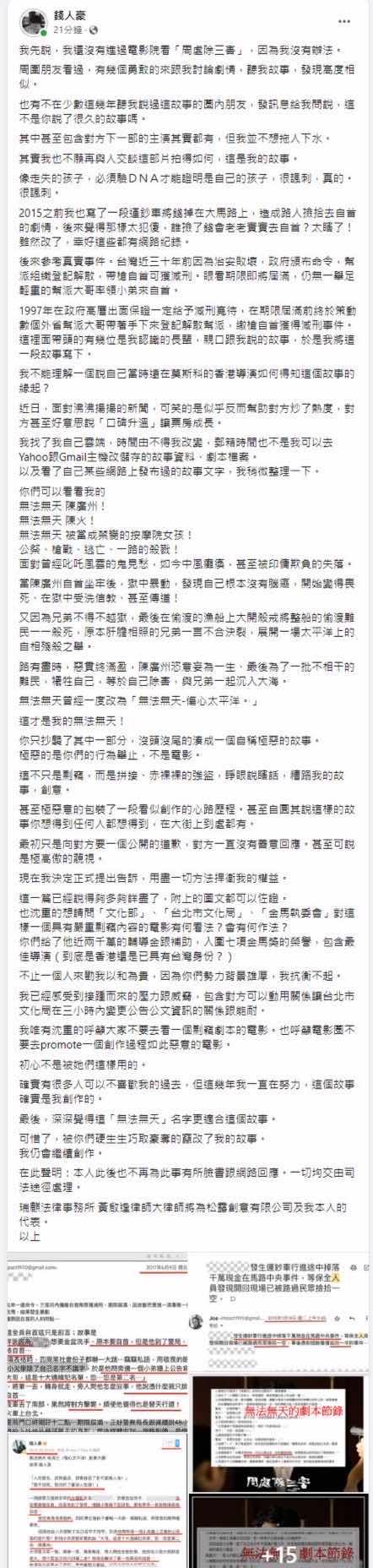 以下除了雙方爭議,也包含部分劇情爆雷,因此尚未看過電影的,請斟酌往下觀賞 ------------------防雷線------------------------------------------------- 首先針對電影的部分,我個人是給予滿分100分的話,高達90分的評價。的確,《周處除 三害》是個大膽的嘗試,有著台灣黑幫的道地江湖味,還冠上港式古惑仔滿滿的英雄魅力 ,如果不是爆出抄襲爭議,入圍第60屆金馬獎最佳導演、最佳動作設計、最佳視覺設計、 最佳原創電影音樂、最佳音效、剪輯以及最佳男主角等7項提名,實在是實至名歸。 回歸正題,當抄襲議題爆發後,網路上瞬間出現兩種輿論,一派當然是當初力挺來自香港 黃精甫導演的演員群和宣傳方,包括當初看完試片後有部分發出好評的影評人;相對地, 錢人豪導演過往因為個人評價因素,但也有人因為他專拍類型片而被他圈粉,包含台灣獨 立影評人彌勒熊、知名編劇甄偉健、三立資深攝影Bio-Man的nacgm世界(影評碟評) 等也都支持其言論,於是我邊看電影邊作筆記,在觀影結束後查詢相關臉書以及私訊錢人 豪導演能否提供相關抄襲證據,以利進行比對,結果如下: 1. 人名:阮經天飾演的陳桂林(原陳廣州)、李李仁陳灰(原陳火),此部分有87%相似 ,不構成剽竊。 2. 事件:悍匪去自首被值班小員警叫去排隊,發現自己只是排行榜第三名(原為第二名 ),然後憤而要去幹掉第一、二名(原為幹掉第一名)再回來自首。此部分就極為雷同, 然而有的人天生通靈,勉強算過關... 3. 故事來源:根據錢人豪導演說法,原《無法無天》最早啟源來自於我1997~2002當導演 前在林森北路街頭討生活的部分閱歷,在2006年3月開拍地下秩序,機緣巧合透過賈哥邀 請來台灣竹聯、四海、天道盟、松聯、 圓環、飛鷹、艋舺、縱貫線等八個社團的精神領袖客串電影,聽他們分享的人生經歷故事 ,真實的台灣社會秘辛加上我自己的想像而寫成。而根據影評人XXY 視覺動物的分享,陳 桂林的原型人物叫劉煥榮,綽號「神經」, 是來自台中市北屯區的眷村子弟,大家有興趣可以去查查(但根據錢導說法,陳廣州只是 參考劉煥榮,還綜合其他人物故事。) 以上資訊僅為個人調查,僅供參考,因聽說後續錢人豪導演將召開記者會並出示證據,我 個人認為就算此人過往有任何爭議,凡事就是就事論事,也希望對方的行銷、宣傳團隊不 要打烏賊戰,這只會顯得低俗、沒格調, 話說一個香港導演能拿台灣輔導金,這點大家不覺得很奇怪嗎???難道他有台灣身分證 ???如果還是香港導演,那輔導金資格哪來的? 以下是黃精甫導演的回應: https://i.imgur.com/D3SUKgo.jpeg