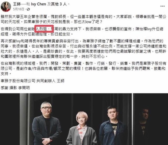 牽猴子創辦人王師在曾經臉書上寫影視界大姐大李烈是公司創辦人,在申請補助經費後, 被人質疑後,居然還可以讓文化局更改公告,我們的政府機關可以這樣輕易被班門弄斧, 是不是應該要有民意代表出來管一下秩序… 超扯!那些不都是我們納稅人繳的錢嗎?暗渡陳倉...簡直荒謬... ----- Sent from MeowPtt on my iPhone -- ※ 發信站: 批踢踢實業坊(ptt-web.org.tw), 來自: 1.200.45.149 (臺灣) ※ 文章網址: https://ptt-web.org.tw/movie/M.1697534879.A.4B1