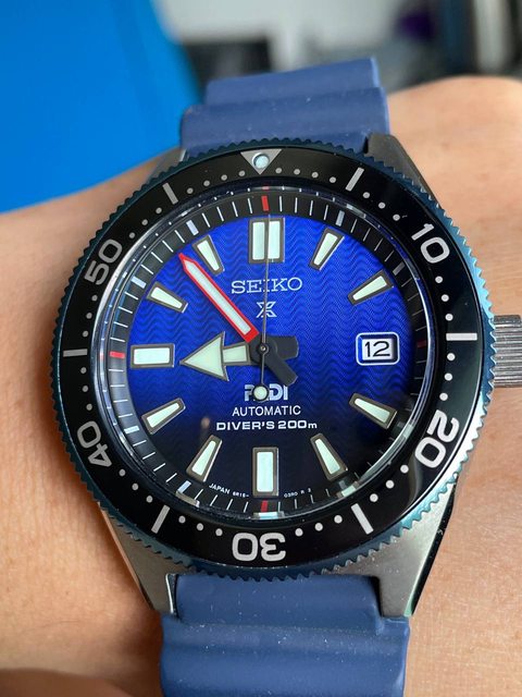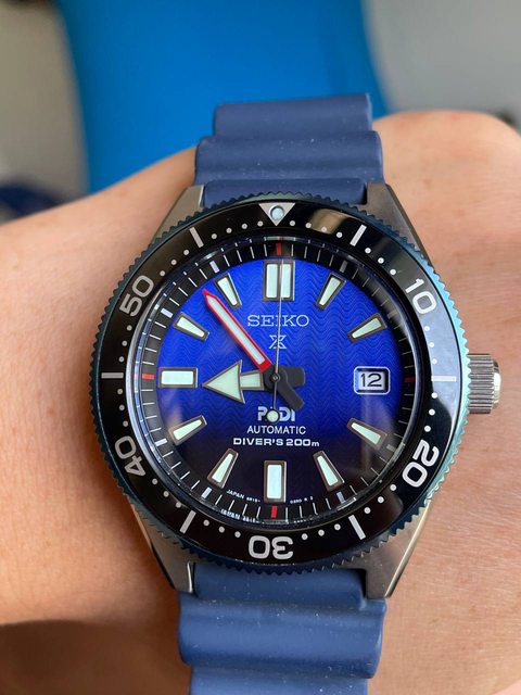 漸變藍色,由藍到黑,波浪紋理,錶圈邊緣藍色,雙色夜光,深藍色膠帶