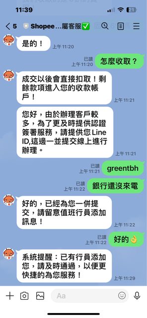 開了說無法交易直接丟假蝦皮line客服給你~客服要你給資料做第三方甚麼碗糕簽署~