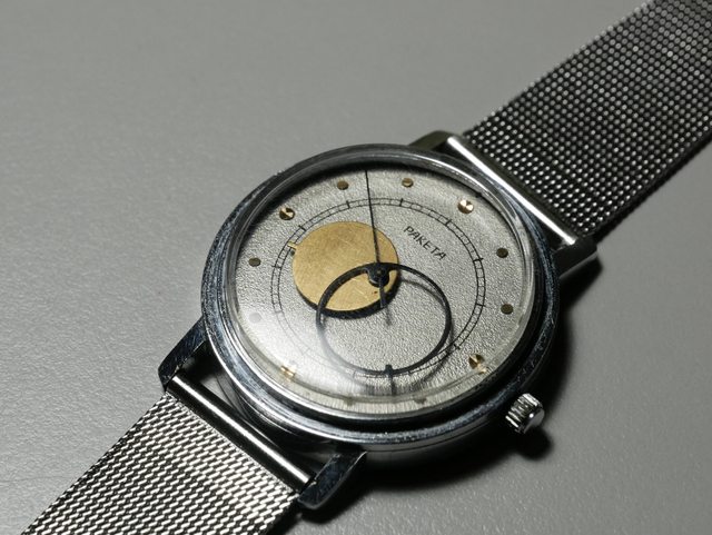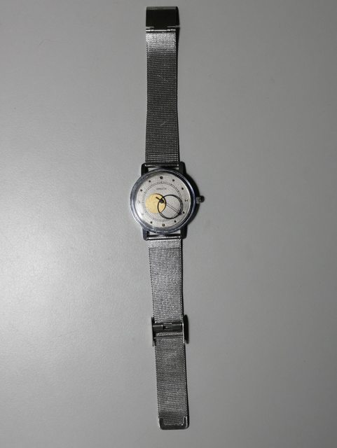 蘇聯80年代經典老錶,指針以金色實心圓盤的時針代表太陽,黑色空心圓環的分針代表月亮,指針設計非常特別
