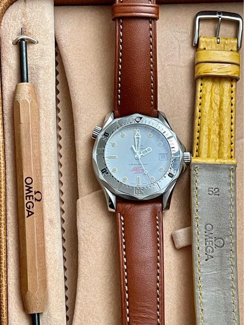 附上配件:盒單齊全,原廠錶帶為鯊魚皮材質全新未使用,另外附有原廠調整錶帶的工具