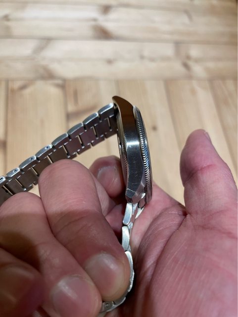 錶頭側邊有傷,錶耳內側有換錶帶的小痕,鋼帶日常配戴髮絲紋,主觀評價整體8.5~9成