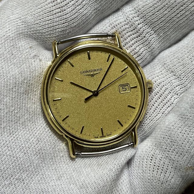 2.浪琴砂礫金面大三針石英錶 4900$ 錶徑含龍頭35,鍍金,無嚴重掉金 無附錶帶,原廠錶扣狀況佳,日期可快調 手錶有使用痕跡等,品相如圖