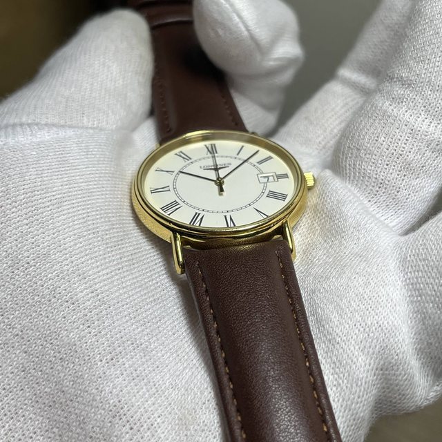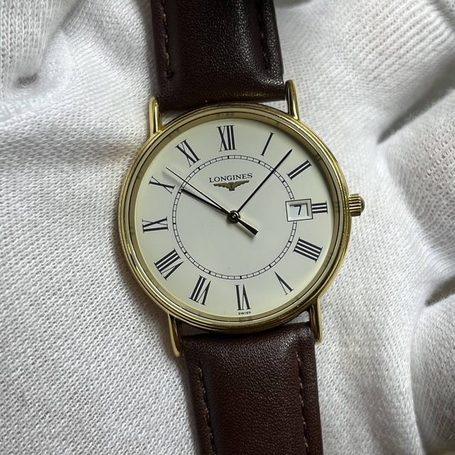 4.浪琴羅馬數字白面大三針石英錶 4900$ 錶徑含龍頭34,鍍金10微米,無嚴重掉金 附全新代用皮錶帶,日期可快調 手錶有使用痕跡等,品相如圖