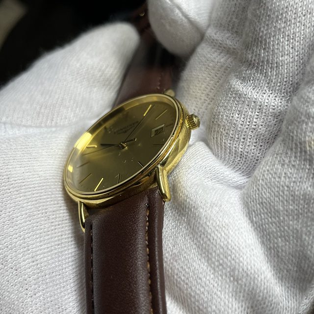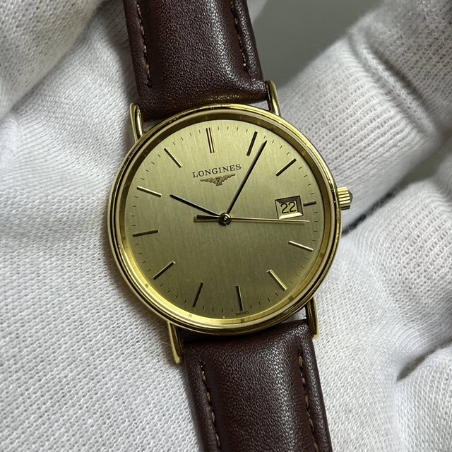 3.浪琴直紋金面大三針石英錶 4900$ 錶徑含龍頭34,鍍金,無嚴重掉金 附全新代用皮錶帶,原廠錶扣狀況佳,日期可快調 手錶有使用痕跡等,品相如圖