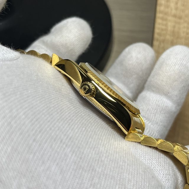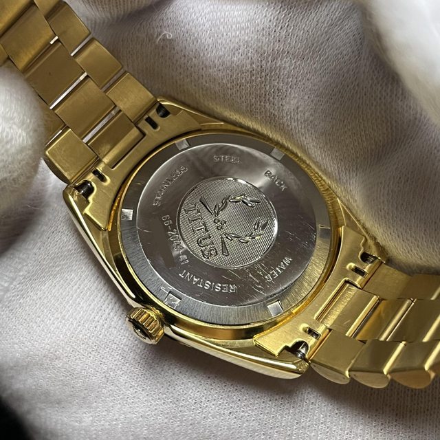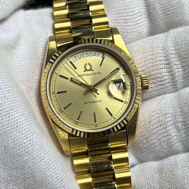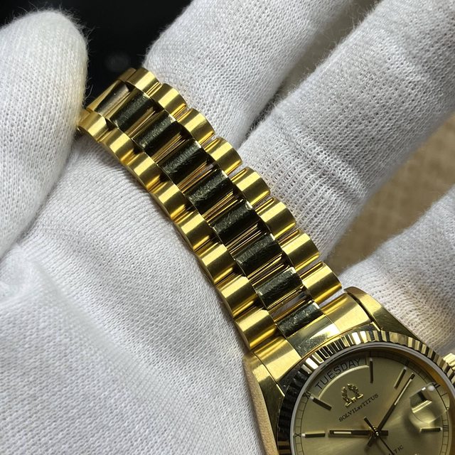 7.Solvil et Titus金色蠔式 自動上鍊機械錶 6800$ 應是ETA2834機芯 錶徑含龍頭38,龍頭可鎖 原廠錶帶手圍約19.5公分 無嚴重掉金,手錶有使用痕跡等,品相如圖