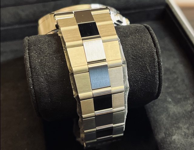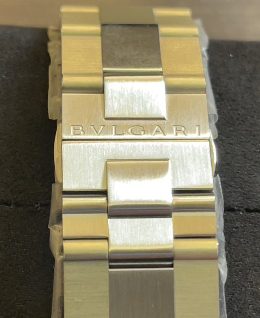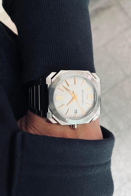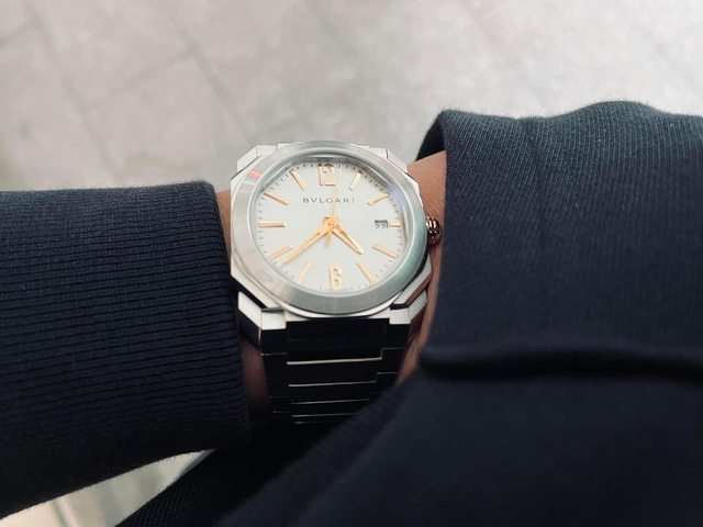 嚴格說來這應該算一體式鍊帶,但也有鱷魚皮帶版本。鍊帶採磨砂面處理,中間鍊節採非鏡面拋光處理,舊款寶格麗的鍊帶厚實度非常讓人驚艷,但細看又非常之細緻,相比於手邊另一只Octo半金大三針,私心認為超越目前寶格麗主流版本,這種衝突感令人印象深刻。