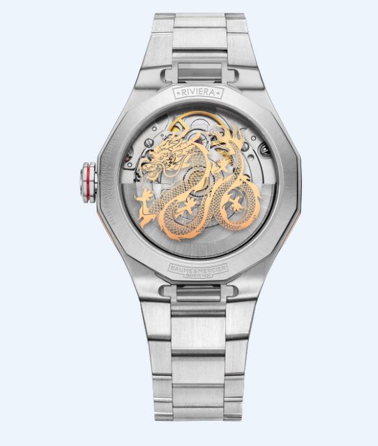 直徑42毫米18K玫瑰金錶殼,透視錶底蓋飾以龍紋圖案