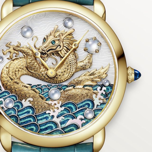 錶盤龍之意象以27個銅件錯落鑲嵌在25個不同的水平面上,日內瓦印記自動上鍊機芯,動