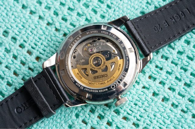 秒針尖走小紅吉字做跳色相當畫龍點睛;夜光分佈於指針及數字時標旁小點;透明底蓋可