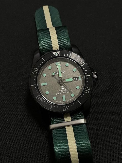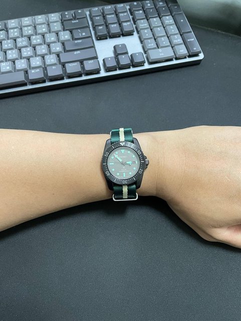 大小.錶耳寬為20mm,也是個非常好買錶帶的尺寸,配上微復古的經典Nato黑綠色錶帶,更
