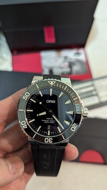 品牌名稱:Oris 手錶型號:Aquis 01733773041350742464EB 保卡年份:2017/09 隨附物件:盒單齊全 膠帶鋼帶都有 欲售金額:23000 所在地區:板橋、大台北 聯絡方式:站內信 物件描述: 錶徑43.5mm、Sw200機芯、藍面,9成新日常使用痕跡,橡膠錶帶鋼帶齊全