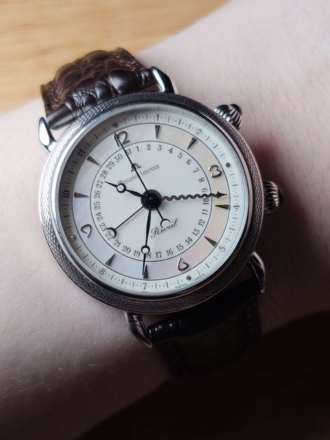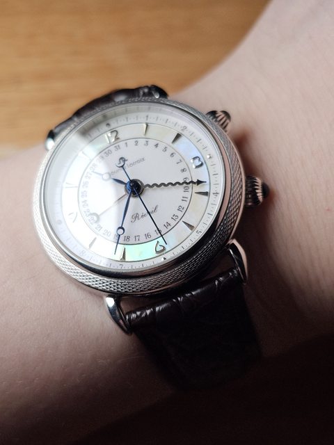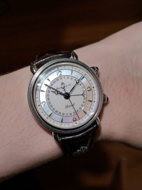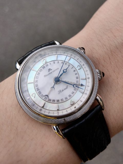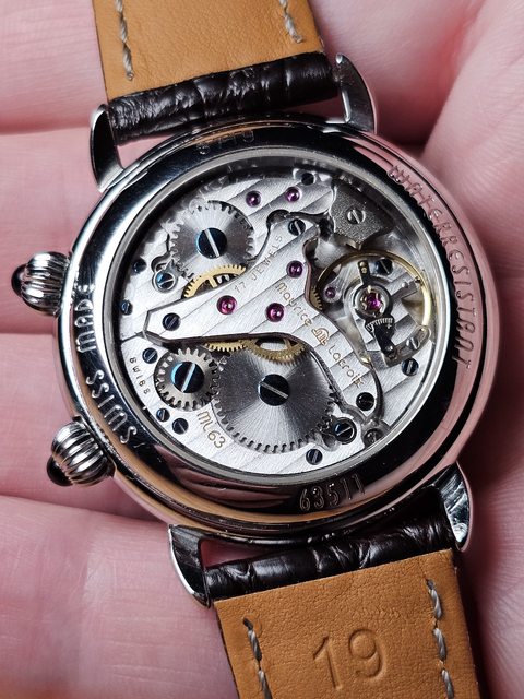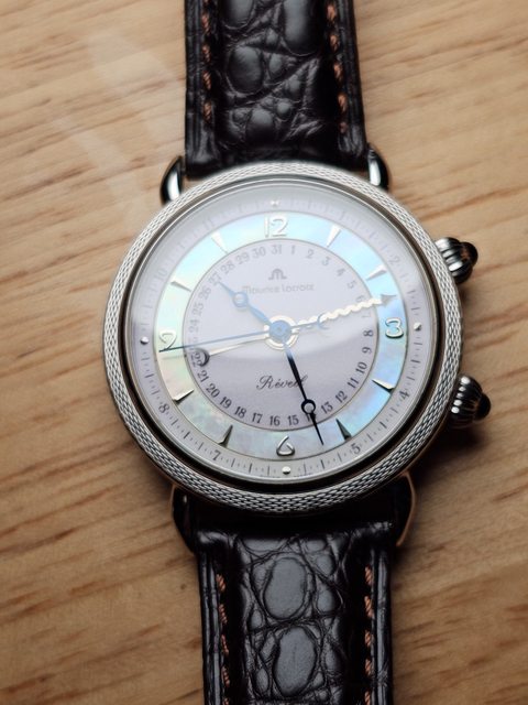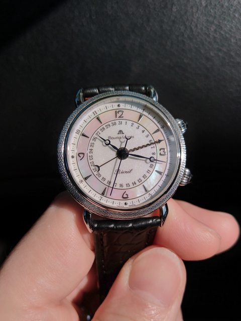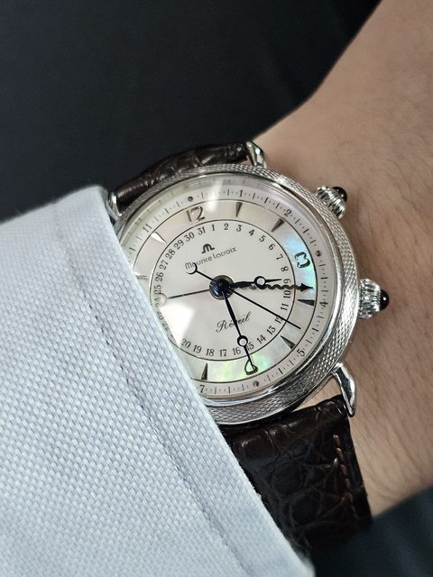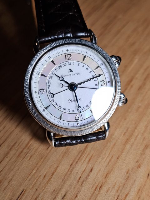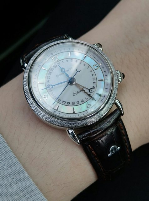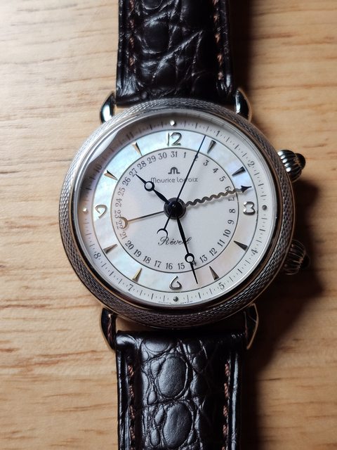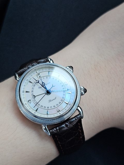 手錶型號:艾美鬧鈴 Maurice Lacroix masterpiece alarm 63511 欲售價格:40000 隨附物件:原廠盒 交易方式:樹林、新莊、桃園龜山面交,北部地區可協調面交,寄送店到店免運 物件描述: 二手收藏品,老艾美鬧鈴機芯,鬧鈴聲如同蟬鳴。錶面時標盤為貝母面,鑲嵌的時刻,燒 製藍鋼寶璣針,指針式日期。 錶殼尺寸36mm,去年年初有洗油,功能正常,原廠錶帶錶扣會附上。