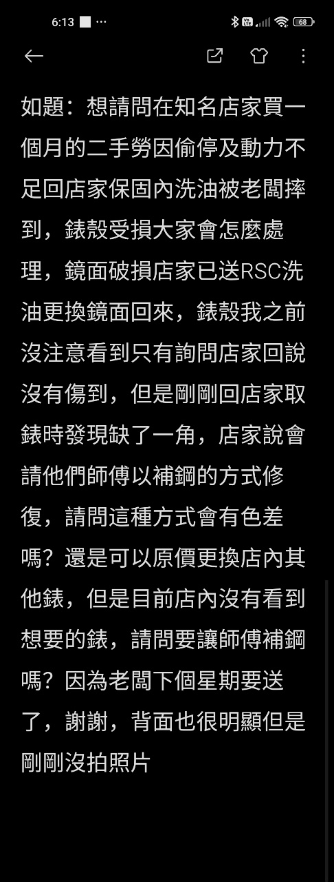 如題:想請問在知名店家買一個月的二手勞因偷停及動力不足回店家保固內洗油被老闆摔 到,錶殼受損大家會怎麼處理,鏡面破損店家已送 RSC洗油更換鏡面回來,錶殼我之前 注意看到只有詢問店家回說沒有傷到,但是剛剛回店家取錶時發現缺了一角,店家說會請 他們師傅以補鋼的方式修復,請問這種方式會有色差嗎?還是可以原價更換店內其他錶, 但是目前店內沒有看到想要的錶,請問要讓師傅補鋼嗎?因為老闆下個星期要送了,謝謝 ,背面也很明顯但是剛剛沒拍照片 https://i.imgur.com/d8kBi0Z.jpeg