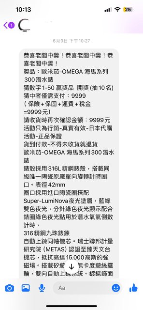 大家好 最近FB常有留言數字抽獎活動 1-50選一個號碼 被抽中的人可以用9999得到一支 Omega seamaster 留下數字後就被通知抽中了 要留下貨到付款的資料 但FB詐騙非常多 點進去該頁面也沒有什麼商家資料 而且seamaster印象中全新都要1X萬 想請問有人遇到過同這種情況嗎? https://i.imgur.com/XpnR6Tw.jpeg