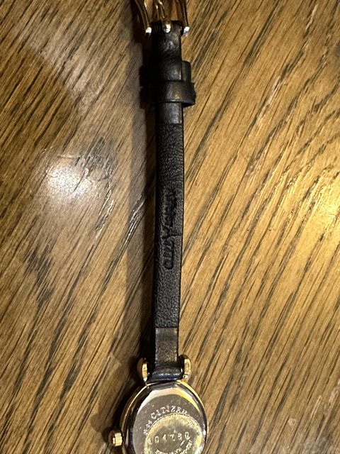 圓形金色錶殼很有特色。黑色皮革錶帶。目前找不到到另一款與這款完全相同的原裝古董Ci