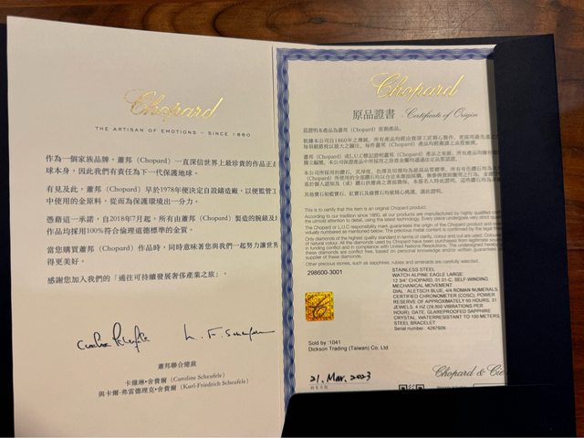 2023年3月於寶鴻堂購入,很少配戴,錶況99.9%新, 因錶款升級故出售給喜愛蕭邦的愛錶