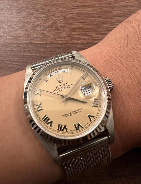 最近跟錶友收了一隻1980年左右的18039 年紀比我大一些,但錶況良好 可惜收來時就沒錶帶 只有錶頭 https://i.imgur.com/S6a6Wgt.jpeg