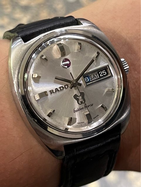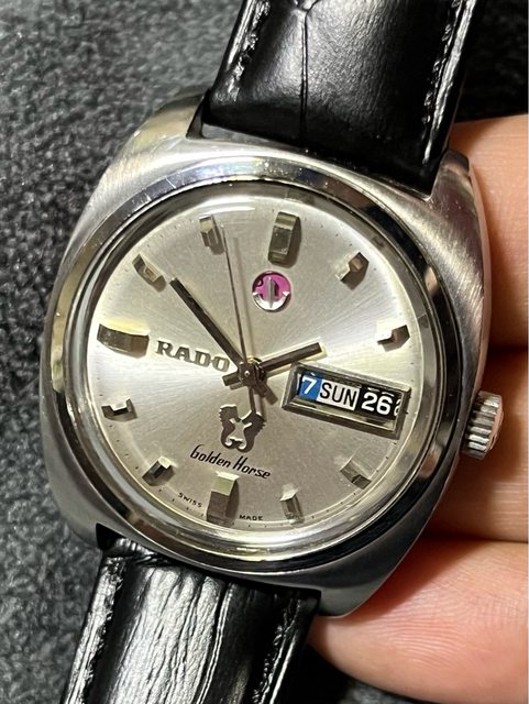 售 RADO GOLDEN HORSE 3 6 9 12點各有元素 視覺相當平衡的配置 銀色放射面盤搭配立體時標 瑞士原裝As金肉機芯 原裝龍頭 全新風防 全新錶帶 船錨可動 售5800