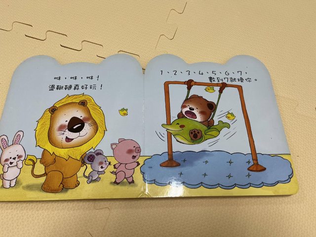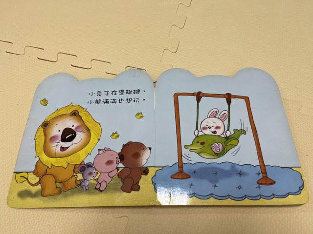 我會跟小孩說:「你看,兔子在玩盪鞦韆ㄟ!好好玩喔,熊熊,豬豬,老鼠,獅子也想玩,但他們在排隊」