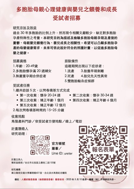 多胞胎母親心理健康與嬰兒之餵養和成長受試者招募