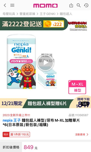 標題[好康] 滿意晚安褲1099/箱,麵包超人849/箱