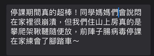 : 空間大,可以在家裡或是社區裡做的事情很多。尤其在COVID停課期間非常慶幸住在山