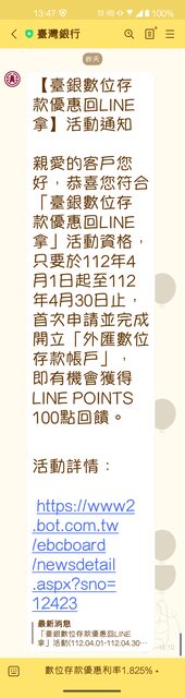 去年於「臺銀數位存款優惠LINE相伴」期間只開了台幣拿了100 LINE點