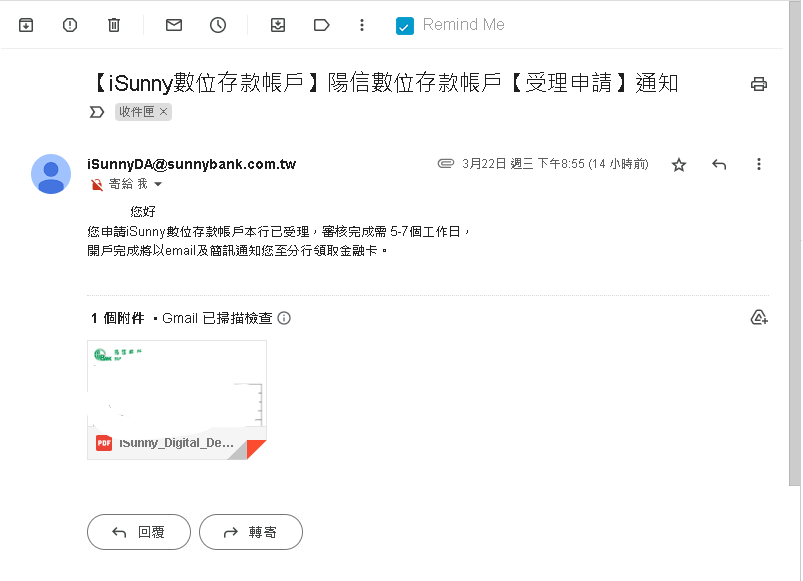 推 Kazamatsuri: 結果10:03接到電話 只是提醒開戶成功後要來分行拿卡 03/23 13:32