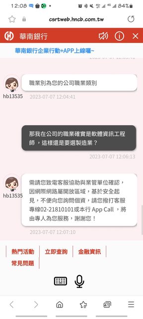 推 aegismargo2: 同軟體工程師 之前去兆豐開戶也是填製造業..07/07 13:41