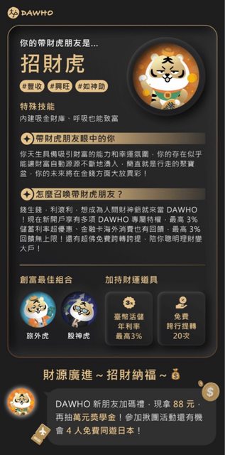除了開戶活動外也推出心理測驗小遊戲-哪個DAWHO帶財虎是你的好朋友