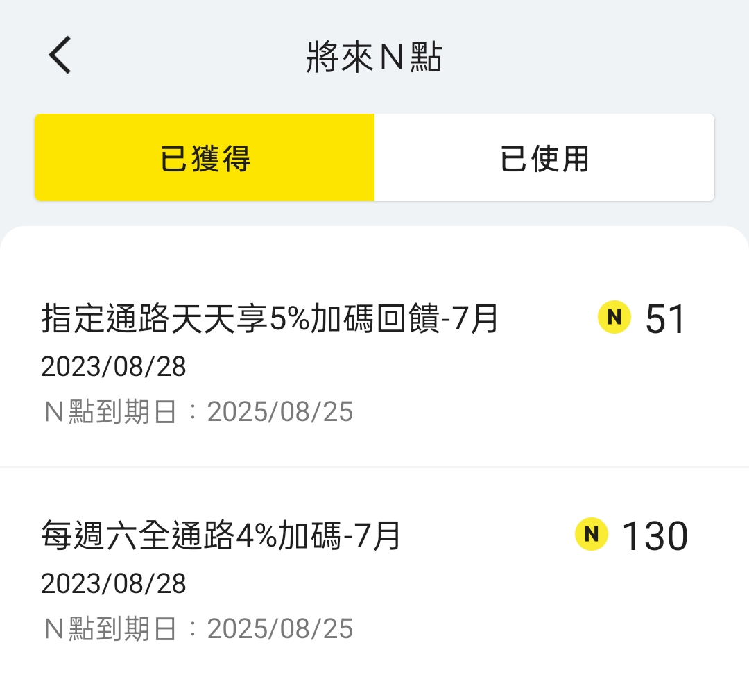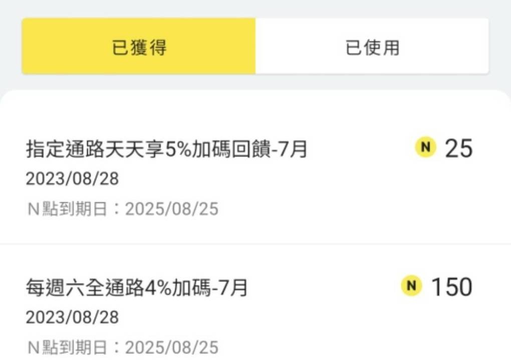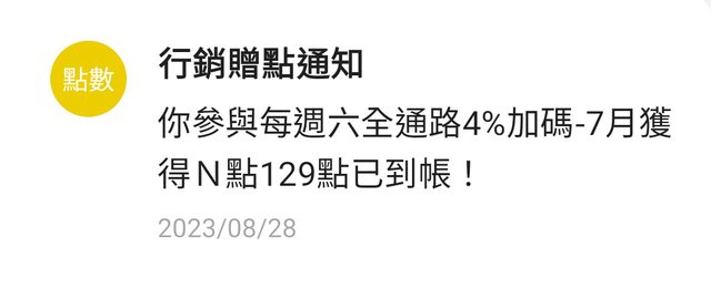 我自己是只有參加每週六全通路4%加碼的活動,剛剛收到通知,7月份消費回饋的N點已入帳