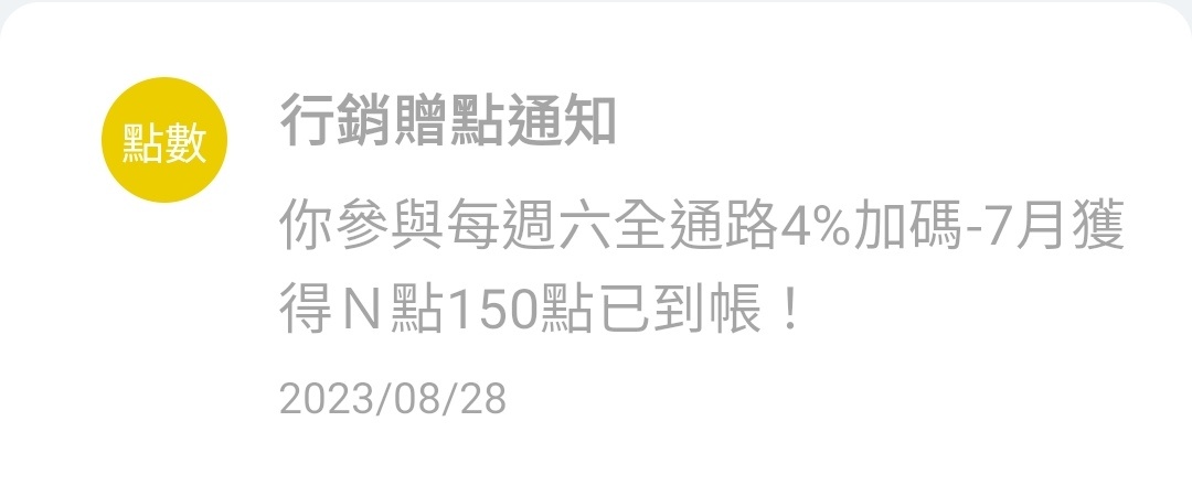 每週六全通路4%加碼的活動,每月上限就是150N點,有消費的可以檢查看看。然後加碼活動