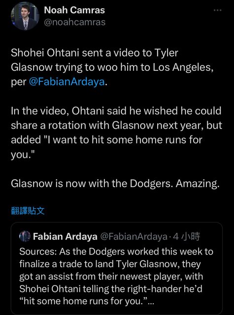 大谷翔平寄出影片試著招募Glasnow 來洛杉磯。