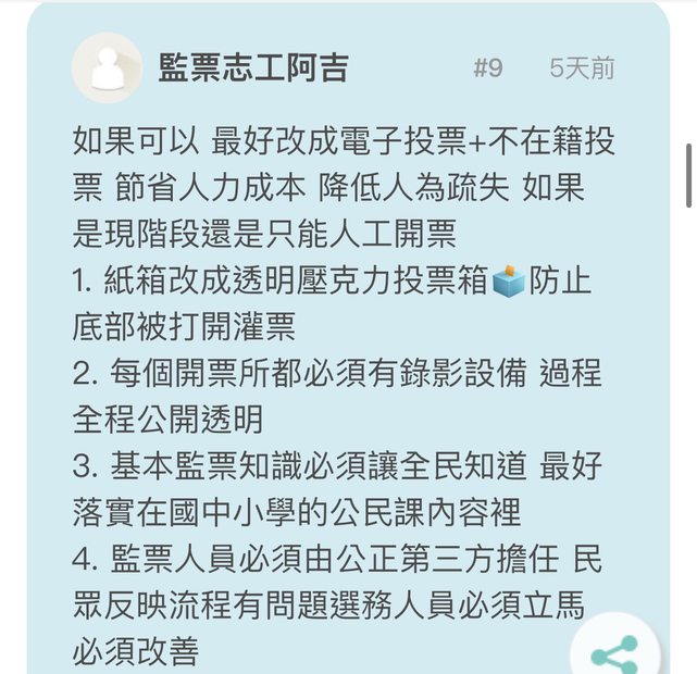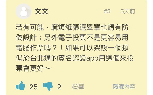 proman614: 想要電子投票又要公平透明開票?寫的人不會覺得很矛盾 01/22 10:09