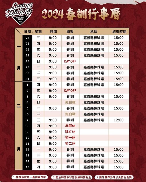 樂天春訓行程出爐,有開放觀眾席給球迷看春訓 -- ※ 發信站: 批踢踢實業坊(www.ptt-web.org.tw), 來自: 118.150.163.48 (臺灣) ※ 文章網址: https://www.ptt-web.org.tw/BaseballXXXX/M.1705899030.A.2D7