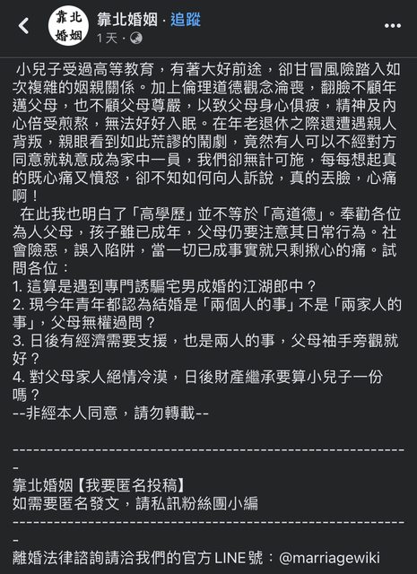 → taddy0540: 辛苦養了一、二十年的小孩 忽然被認一 01/25 12:04