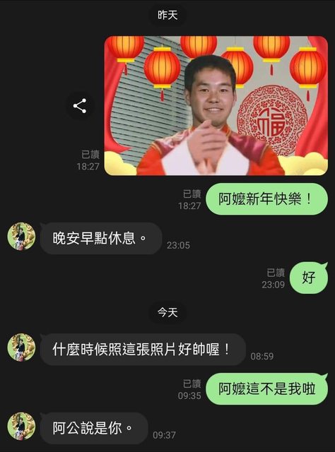 傳給阿嬤新年賀圖 結果被誤會是照片裡面的人 我該怎麼辦 ----- Sent from JPTT on my Asus ASUS_AI2201_F. -- http://i.imgur.com/4aoFHiW.jpg