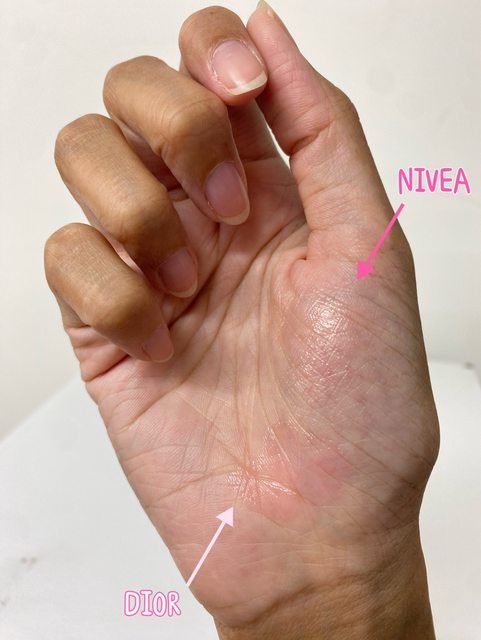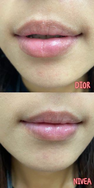 唇膏質地NIVEA比DIOR略軟一些,抹開滑順~直接擦在乾唇上沒有卡卡的