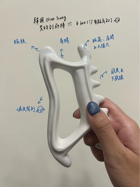 前陣子去韓國在OliveYoung跟著掃了三隻刮痧棒,有各種角度能按摩太陽穴、下顎線和眼
